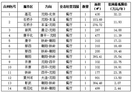 2.2招商范圍及合同包劃分:本次招商業(yè)態(tài)為石橋子、那四、開原服務(wù)區(qū)雙側(cè)餐廳共計(jì)6個(gè);高花(沈陽—北京方向)餐廳1個(gè)、新民(通遼—沈陽方向)餐廳1個(gè)、康平(鐵嶺—朝陽方向)餐廳1個(gè)、康平北(康平—沈陽方向)餐廳1個(gè)、朝陽(朝陽—鐵嶺方向)餐廳1個(gè)、鐵嶺(四平—沈陽方向)餐廳1個(gè)、復(fù)州河(大連-沈陽方向)餐廳1個(gè),彰武(朝陽-鐵嶺)餐廳1個(gè),桃花吐(鐵嶺-朝陽)餐廳1個(gè),本項(xiàng)目共劃分為14個(gè)合同包。