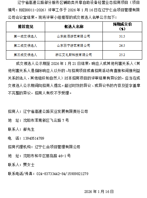 遼寧省高速公路部分服務(wù)區(qū)輔助類共享自助設(shè)備經(jīng)營業(yè)態(tài)招商項(xiàng)目成交候選人公示